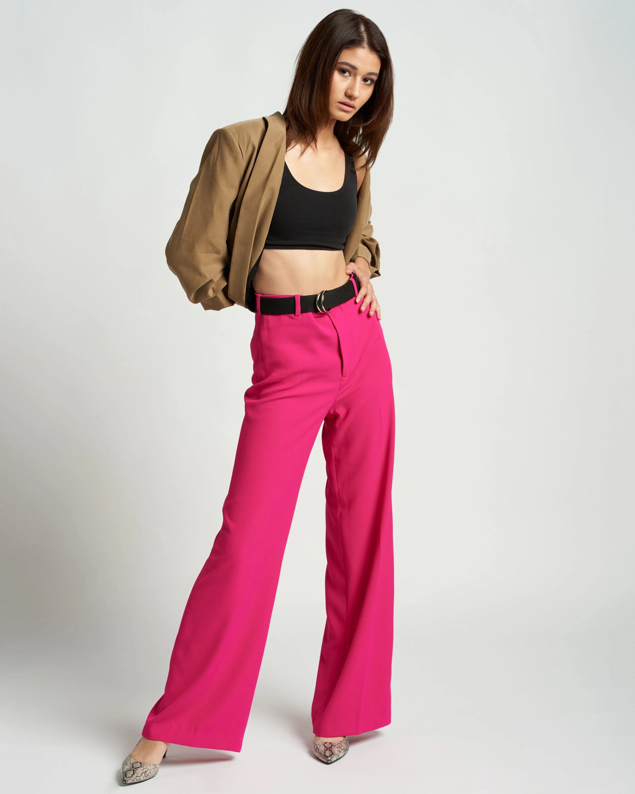 Fashion model wearing beige blazer, black crop top, pink wide-leg pants, and snakeskin heels posing in studio.